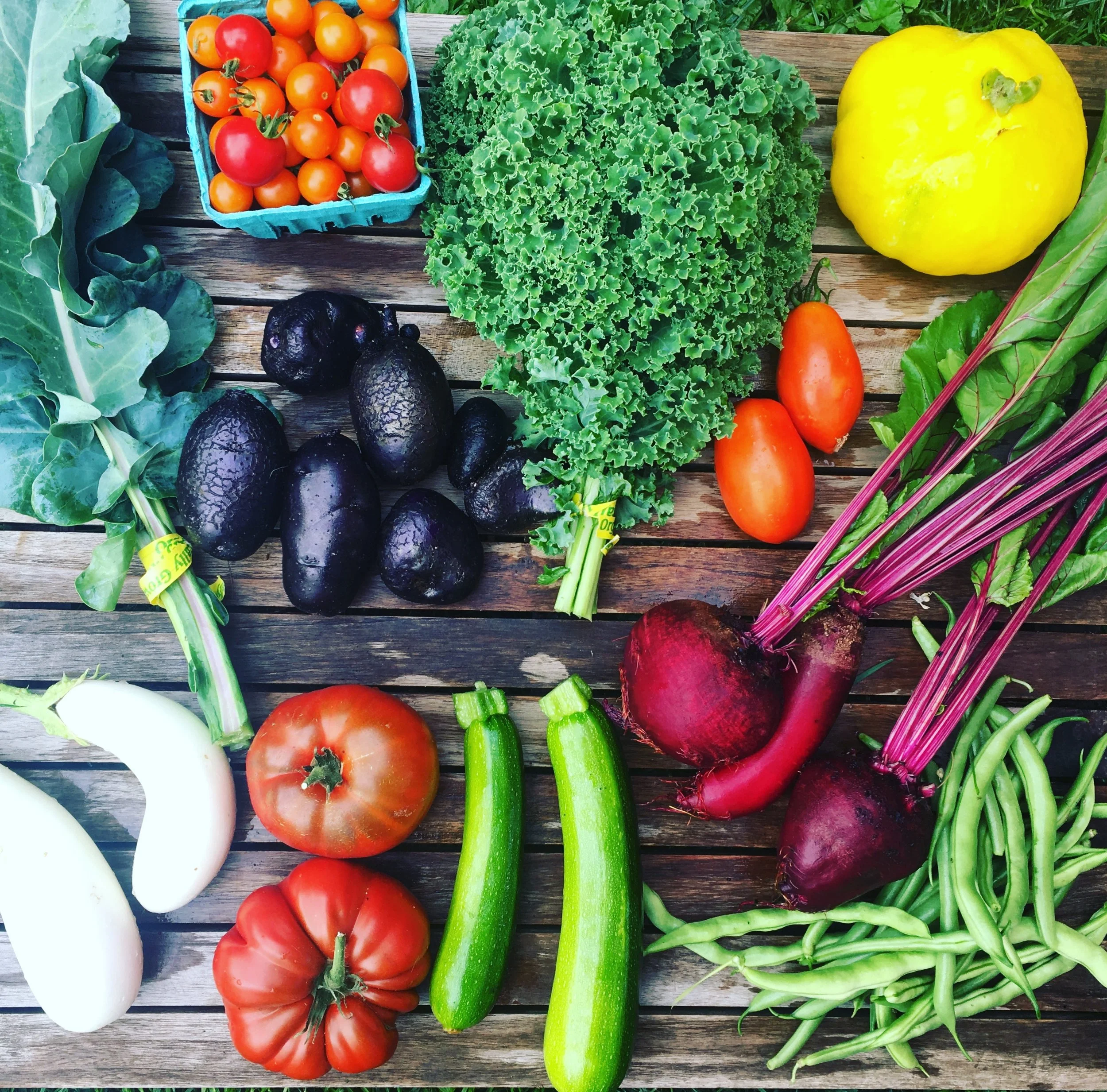 Artichokes, Asparagus, Beans, Beets, Brussels Sprouts, Broccoli, Broccoli Greens, Cabbage, Carrots, Cauliflower, Chard, Corn, Cucumbers, Eggplants, Garlic, Garlic Scapes, Gourds, Ground Cherries, Kale, Kohlrabi, Lettuce, Leeks, Melons, Onions, Parsnips, Peas, Peppers (Hot), Peppers (Sweet), Potatoes, Pumpkins, Radish, Rhubarb, Rutabagas, Spinach, Summer Squash, Tomatoes, Tomatillos, Winter Squash.